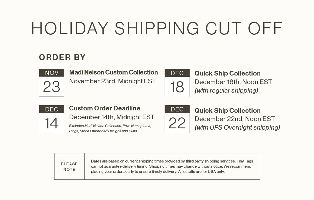 Most custom orders (excluding certain items) must be placed by December 14th at midnight EST for holiday delivery.
